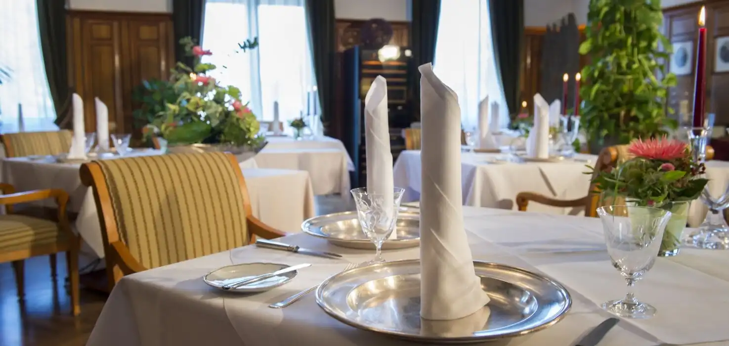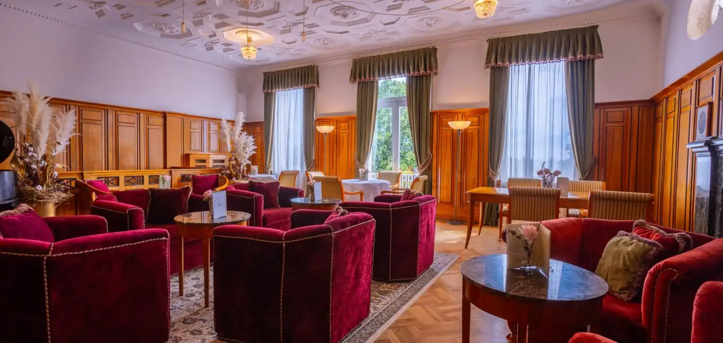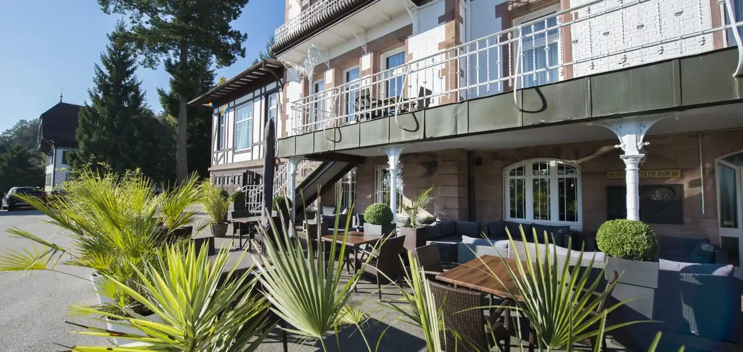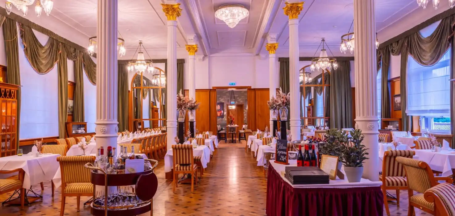 Das Restaurant:Tauchen Sie in die erhabene Schönheit unseres Gourmet-Restaurants „Palmenwald“, dem Frühstücksraum, der Kamin-Lounge, der Aussichtsterrasse und der Hotel-Bar „Paul Lechler“ ein. Dekoriert im prächtigen Jugendstil, mit handgefertigten Möbeln. Genießen Sie die Ruhe unter den Klängen klassicher Musik und die kulinarischen Spezialitäten der modernen und traditionellen Küche.