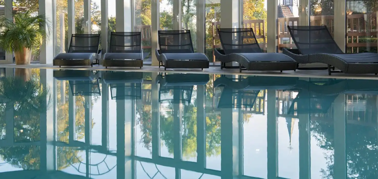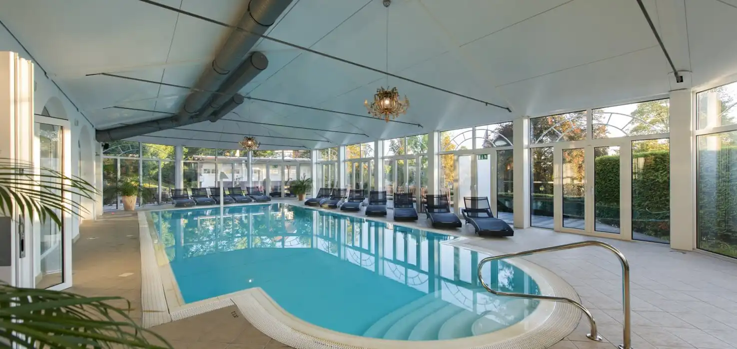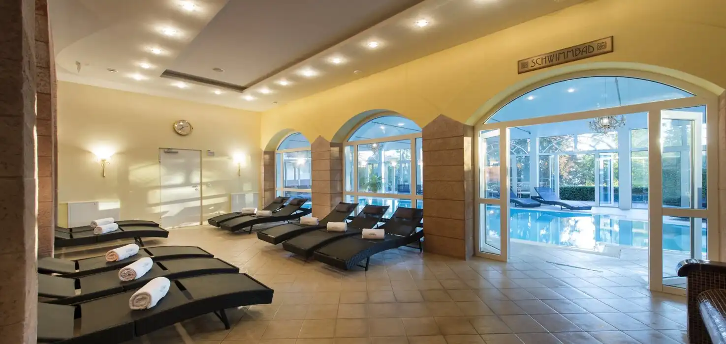 Der Innenpool:Die Wassertemperatur des „ROSEN SPA“ Innenpools, wird bei 28 Grad gehalten und die Lufttemperatur im Raum bei 29 Grad. Vergnügen Sie sich unter den Strahlen des hydromassierenden Jets und entspannen Sie anschließend, im imposanten Ruheraum.